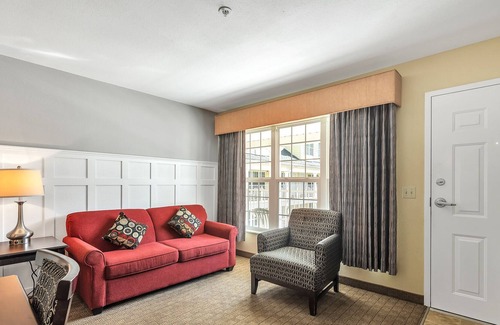Iroquois Suites 213 is situated on the second floor of the hotel, and actually have two levels. The first floor contains living and sleeping areas separated by the bathroom. The second or loft level has a spacious bedroom with two queen size beds and a cozy sitting area by the dormer window that overlooks the lake. Each of these units also has access to a common balcony. This unit can sleep up to six adults.