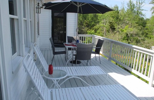 First Floor: Featuring the kitchen, dining room, living room, washer/dryer, as well as two of the 4 bedrooms. The first bedroom is located to the left of the entryway, with 2 twin beds, the master bedroom on the first floor has a queen bed and an attached shared bath with tub/shower. On the deck, guests can dine alfresco or soak up some rays in the chaise lounges.