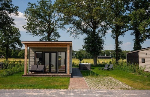 Enjoy a panoramic wellness lodge with jacuzzi, traditional Finnish sauna and walk-in shower with sunshower. And all this in an cosy lodge with a view over the meadows of Twente, straight from of your bed! In your bedroom you can enjoy a traditional Finnish sauna and jump under the walk-in shower with sun shower. You rarely see such a cool bedroom!