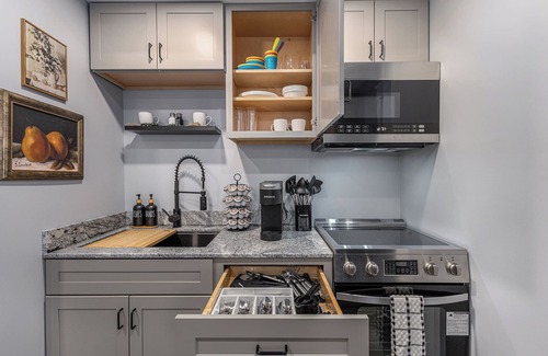 - The kitchen is fully stocked with a fridge/freezer, sink, stove, oven, microwave, toaster, blender, and coffee maker. We also provide essential items like plates, cups, cookware, utensils, and paper towels.