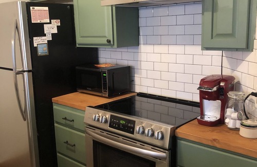This fully renovated space offers a chef's kitchen with brand new appliances and a spacious butcher block countertop with seating. Dining table also offers space for 4. Kitchen comes equipped with cooking essentials to whip up a meal at home. Let the dishwasher do the work, and you unwind with a cocktail.