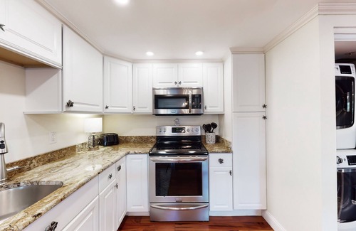 Sun-kissed and fully updated, this second-floor vacation rental boasts a bright and open kitchen with granite countertops, stainless steel appliances, and a breakfast bar with plenty of space for your entire group. After meals, find your perfect place on the enormous, plush sectional in the living area and stream all your favorite channels into the evening as boats come and go out in the marina.