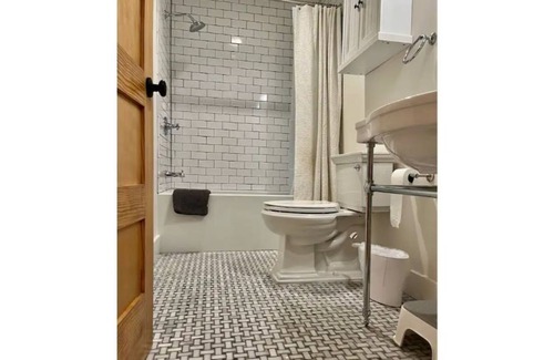 This bedroom uses the shared hall bath, although it is right outside the bedroom door. This bathroom has a bathtub.