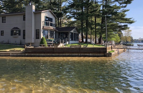 The home has 4 bedrooms plus a Master bedroom (5 Bedrooms total) with a balcony overlooking the lake. There is a large well stocked kitchen and a dining room with a wood burning fireplace that comfortably seats 12. The living room has 2 sofa/sleepers and 2 love seats as well as a piano. The living room opens into an expansive sun room with extra living and dining space. The sun room offer a beautiful view of the lake and island. There are screens on all windows and sliders. There is a table with umbrella and chairs as well as lounge chairs on the deck by the canal. There is also a private sandy beach area with a 2-foot sea wall for sand lovers.