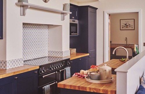 Beyond the boot room is the open-plan living space with kitchen, dining and lounge areas. The kitchen is equipped with a range oven, large fridge/freezer and a dishwasher, while the dining area has a dining bench and chairs perfectly positioned to take advantage of the views. Meanwhile, the comfortable, restful living area features sofas, a log burner, a Smart TV and bi-folding doors with those gorgeous views again.