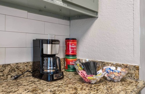 ⚜️ KITCHEN - A fully stocked kitchen that includes: ▫️ Pots, pans, blender, toaster, plates, bowls, cups, wine glasses, & mugs ▫️ Spoons, forks, butter knife, steak knives, & chopsticks ▫️ Coffee maker with regular/decaf grounds, creamer, sugar, & straws ▫️ Electric kettle with variety of tea ▫️ Misc. items such as wine/bottle/can openers, grater, coasters, & salt/pepper/hot sauce ▫️ Dishwasher ▫️ First aid kit & fire extinguisher ▫️ Dining table for 2