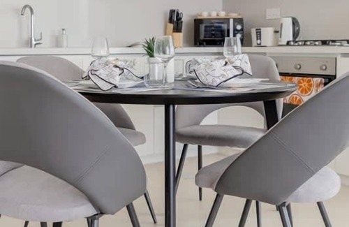 Cook your meals in the fully functional open kitchen equipped with a stove, microwave, toaster, kettle, coffee maker, fridge, cutlery, cookware, and other kitchen accessories. Serve the meal and dine in together with your loved ones in this chic dining area that comes complete with upholstered dining chairs and a black-sleek round table.