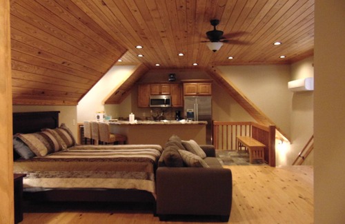 This 950 square foot garage apartment with solid pine floors and ceilings, Queen size bed, HDTV with Satellite, Full kitchen with stove/ oven, large stainless steel refrigerator, dishwasher, a second standalone oven, copper farmhouse sink, granite countertops, wine chiller, full washer and dryer, Chest of drawers, shower and toilet. Views out some windows show the lake. Access to the dock. Entryway is a numbered keypad so no key is needed. Garage may be used to park a car if house is vacant. Separate AC/heater just for apartment. Outdoor fireplace also available if house is not rented.
