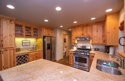The beautiful floor-to-ceiling windows provide endless forest views and allow the Sierra sun to shine in while the river rock hearth (with gas fireplace) provides a true cozy mountain feel. Located on a friendly cul-de-sac and a FLAT LOT making accessibility easy (especially during those winter months) and adds a fun space for children to ride bikes and play basketball outdoors with friends.