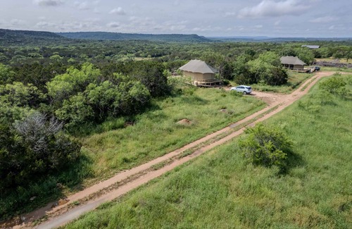 Our geo dome sits on a beautiful and spacious deck overlooking the hill country. Lounge outside and enjoy a coffee or evening beverage, and take in the stunning views. Or relax on the playful hammock, built directly into the platform. In the evenings, Edison string lights create a relaxed ambiance. Inside, find the comforts of a hotel room inside the safari tent. Plunge into a peaceful night’s sleep in the cozy king-sized bed with comfy bedding and linens. An additional air mattress is available for extra guests. The living space also includes a sitting area and the conveniences of a counter-height refrigerator (with freezer shelf), microwave, and coffeemaker. A standing telescope and tripod provide an opportunity to explore the endless night sky, free of light pollution far away from the city. Color-changing interior mood lighting can be controlled via remote. Your attached, personal bathroom includes a marble-top double sink vanity, toilet, and a private clawfoot tub and attached shower. Enjoy the plush set of towels. Since we have developed a carefully placed water and septic system in an intimate and remote retreat, we ask that our guests help us preserve the environment by moderating use of water.
