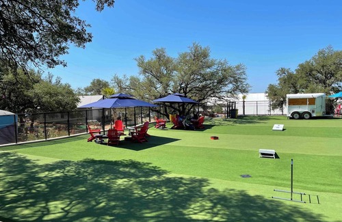 And the best part? You'll be staying at the Dreamland grounds! Dreamland is a outdoor entertainment and arts venue that features 16 dedicated Pickleball courses (4 covered, 12 uncovered), exciting terrain based miniature golf and disc golf courses, and one state of the art music stage. Dreamland is also an incredible art experience, with large scale sculptures, murals, & mosaics commissioned by some of the world’s top artists. There's a bar and outdoor family beer garden, and a children's splash pad & playground, stage for live music, and large picnic tables to relax and enjoy a livestream of your favorite games on our large flat screen TVs. The full bar features one of the largest 50 self-pour tap walls located in the Texas Hill Country including local beers, ciders, & cocktails. Activities are pay-to-play, but look out for happy hour prices (up to 50% off!) and kids under 5 always play for free.