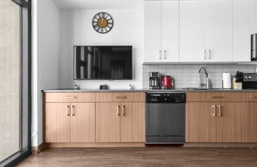 Welcome to your stylish 2-bedroom retreat! Enjoy stunning city views through large windows that fill the space with natural light. The open living area features comfortable seating and a flat-screen TV, perfect for relaxing. The fully equipped kitchen is a chef’s dream, with modern appliances and ample counter space.. With a modern bathroom, high-speed Wi-Fi, and a prime location near dining and attractions, this apartment is your perfect home away from home!