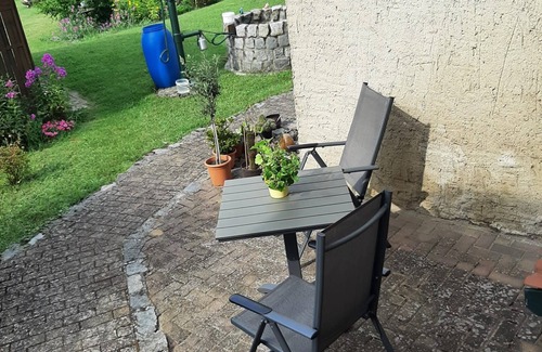 The apartment has a floor space of about 80 square meters and has a living room and 2 bedrooms and a separate kitchen and a bathroom with corner bath. She also has a porch, which is ideal for breakfast and weather in bad weather to look into the garden, to organize a game afternoon with the children or even in the evening on cooler days there to enjoy a glass of wine. On the property is a parking space and a seating area with garden furniture, parasol and barbecue reserved for you. Bring your bicycles and hiking boots - there are many cycling and hiking trails around Priepert, such. B. also the Jacob's way.