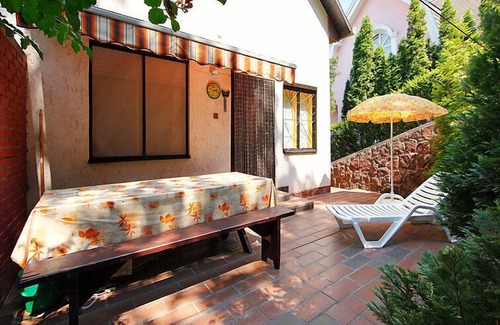 Balatonalmádi 15 km from Balatonfüred: Child friendly semi-detached house "Kiwi". 800 m from the edge of the forest, 380 m from the lake, 1 km from the beach, in the countryside. Private: garden. Barbecue, fireplace. Grocery 300 m, supermarket 5 km, restaurant 500 m, bakery 4 km, bicycle rental 2 km, railway station 1 km, grass beach 1 km, thermal baths "Hévíz" 81 km. Sailing school 4 km, tennis 3 km, riding stable 4 km, cycle lane 300 m, children's playground 1 km. Nearby attractions: Balatonfüred 15 km, Tihany 20 km, Veszprém Zoo 15 km, BalatonBob Theme Park 8 km, Annagora Aquapark 15 km, Balaton Golf Club 22 km.