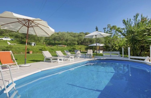 Piano del Quercione 2 km from Massarosa: Child friendly, rustic 2-family house "Olivo", 4 storeys, detached, renovated. 1.9 km from the centre of Massarosa, 18 km from the centre of Lucca, 22 km from the centre of Forte dei Marmi, in a sunny, elevated position in the residential district, 8 km from the sea, 7 km from the lake, 8 km from the beach, located by a road. For shared use: natural state property 10'000 m2, terraced garden. Private: garden 500 m2, swimming pool (7 x 3 m, depth 120 cm, seasonal availability: 04.May. - 07.Oct.). Terrace (50 m2), garden furniture, barbecue. In the house: internet access, central heating system, washing machine, heating to be paid on the spot (01.Nov. - 31.Mar.), heating available only from 01.Nov. - 31.Mar.. Linen change weekly. Parking (for 2 cars) on the premises. Grocery, supermarket 500 m, restaurant 1 km, bus stop 200 m. Nearby attractions: Pietrasanta 13 km, Viareggio 7 km, Pisa 41 km, Collodi Pinocchio Park 40 km, San Giuliano Terme 19 km, Firenze 93 km. Well-known lakes can easily be reached: Lago di Massaciuccoli 12 km, Torre del Lago 12 km. Please note: car recommended. Groups of teenagers on request only. The owner lives on the same property.