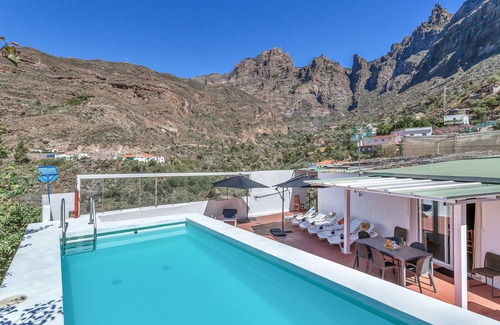 The holiday home Vv Pedacito de Cielo, which is situated in San Bartolomé de Tirajana, overlooks the nearby mountain. The 150 m² property consists of a living room with a sofa bed for one person, a fully-equipped kitchen, 2 bedrooms and 1 bathroom and can therefore accommodate 8 people. Additional amenities include high-speed Wi-Fi (suitable for video calls), a TV, air conditioning, a washing machine as well as children's books and toys. Crib and high chair available upon request to the property. This vacation rental features a private outdoor pool, a spacious garden, 2 covered terraces, an open terrace, and a barbecue. Enjoy the perfect outdoor setting for your vacation getaway.