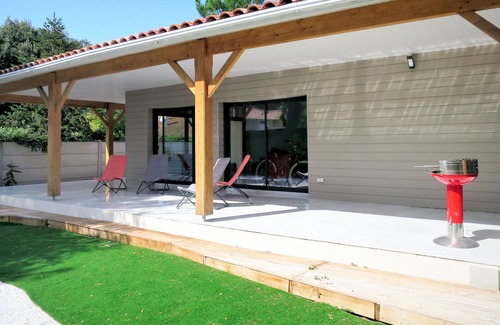 Beautiful house "Yara", built in 2018. 3 km from the centre of Lacanau Océan, 10 km from the centre of Lacanau Ville, 55 km from the centre of Bordeaux, in the residential district, 3 km from the sea, 3 km from the lake. Private: well-kept garden 400 m2 (fenced) with wildlife garden and trees, parking at the house on the premises. Supermarket 3 km, bus stop "Le Huga" 260 m, sandy beach "Plage Centrale Lacanau" 3 km. Golf course (18 hole) 1 km, surf school 3.5 km, riding stable 7 km. Please note: main road 20 m from the property.