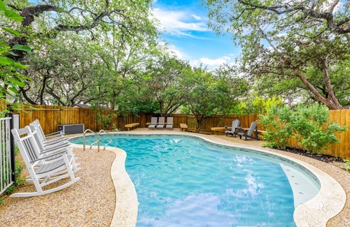 **We support the military - Active duty military families enjoy a 15% Military Family Discount on all stays.** Enjoy this backyard vacation paradise with the whole family. The heated Pool is fully fenced so everyone can stay safe and comfortable! Not swimming? There’s a chair for you by the pool. Catch some sun in a rocker while the kids splash or nap on a long lounger in the shade under the trees. Watch the stars from the firepit, play ping pong or chow down on steaks at the huge outdoor dining table. Rain doesn’t stop the fun here! Play foosball, giant tic tac toe and board games in the game room. Catch a game or movie on one of the 6 huge Smart TV’s. Grandma and Grandpa will appreciate the downstairs, handicap accessible master suite with king size bed that opens onto the fire pit. Parents with young kids will love the king bed master suite upstairs with its giant jacuzzi tub and three additional twin bunks. Enjoy the pool view from the queen bedroom upstairs and let the kids camp out in the bunk room that sleeps 6. This 4 bedroom/3.5 bathroom house has it all: Huge gathering areas for eating and relaxing outside and inside, including giant dining room tables inside and out. This yard may be just minutes from all of San Antonio's attractions, but you'll feel like you're miles away in your own resort. Your family will LOVE the Super Central location just minutes from all major freeways, all the attractions and military bases Fort Sam Houston (20min), Randolph AFB (25min), Camp Bullis (7min) and Lackland AFB (25min) and the best eating and shopping in San Antonio! Many of our guests are friends and family of local San Antonio residents who know that this is a fantastic location in a great area and in a very safe, friendly, walkable neighborhood.