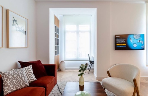 Family vacations in this elegant rental apartment, located in the traditional and cosmopolitan district of Chamberí, will boast great moments to remember. Located in a historic building, on a third exterior floor that enjoys abundant natural light, this elegant rental apartment, ideal for families, has three bedrooms and a study, in an area of 120 m2 with capacity for six people.Its location in a quiet residential area on Calle Vallehermoso, in the neighborhood with the same name and in the Chamberí district, known for its architectural legacy of the most traditional Madrid aristocracy that lived there during the 19th and 20th centuries, is striking. Nearby, the Canal Isabel II Park offers large recreational areas dedicated to sports and leisure, ideal for family enjoyment, as well as theatres, churches and numerous gastronomic options, which are worth discovering during your stay in this wonderful rental apartment. short stay, recently renovated and fully equipped.The balance and warmth seduce at first glance, a space full of natural light and ample dimensions, distributed between the entrance hall, the living room, a beautiful dining room and the open kitchen. On the left side there is a cozy furnished living room that stands out for its maroon-colored three-seater sofa and two beautiful armchairs, a rug and modern paintings that complement the decoration. It has a Smart TV for family entertainment after a day out.At the back of the dining room and with a window overlooking Calle Vallehermoso, a library has been designed. Both the table and the chairs of this beautiful dining room with capacity for six people, are made of dark wood, it also has some ceiling lamps, with exposed cables, which are committed to modernity. The kitchen open to the living room is fully equipped and opts for the combination of dark wood, while contrasting with the countertop with a white marble finish.On the right side of the entrance hall, guests can use a small study or office, which is very comfortable when teleworking. For this, it has a wooden desk, a striking yellow chair, a table lamp and a sofa ideal for reading.In the area to the right of this furnished apartment are the bedrooms and bathrooms, distributed along a corridor with wooden paneling on the floor and walls. The first and second rooms —decorated in white, gray and green tones—, are equipped with a 1.50 meter double bed. and with large closets, as well as a work desk with its respective chair and table lamp, decorated with abstract art paintings. The two bedrooms share a full bathroom with porcelain tile cladding in green tones. In the same corridor there is a guest bathroom with a nice.The main bedroom is ideal for a good rest, it is spacious and very quiet, it is equipped with a Queen size bed of 1.60 x 2.00. meters, a dressing room and a large en-suite bathroom in marble and porcelain stoneware that has two showers. The original touch in the room is provided by a curved wall, on which an original wall-mounted table-desk with two stools and a lamp has been designed.