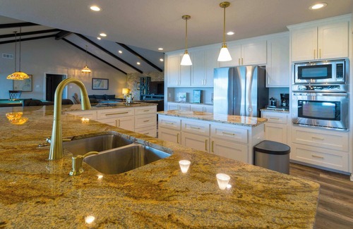 As you arrive, you’ll find the interior is thoughtfully designed, with warm natural light, comfortable furnishings, and large windows that frame the dramatic landscape. Comfort and entertainment meet in the sprawling living room: sink into the oversized sectional or an armchair by the smart TV or challenge your friends to a game of pool in the same inviting space. The heart of the home is the expansive, open-concept kitchen—complete with a sleek, oversized island, counter seating for ten, white cabinetry, and stainless steel appliances—where meals and memories are made. Gather around the large dining table for shared dinners that stretch into the evening.
