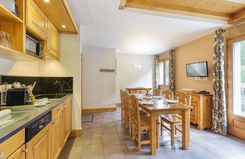 The apartment sleeps 6 people and has been thoughtfully equipped with everything guests might need for a comfortable stay. On the lower floor of the duplex, there is a large, bright dining area with a table for 6 people, sideboards, a flat-screen TV and an open-plan, fitted kitchen. The kitchen is equipped with an induction hob, microwave, dishwasher, fridge/freezer, Nespresso and coffee machines. French windows in the dining room lead out onto a balcony, with a table and chairs and spectacular views out of the mountainside and the ski lift.