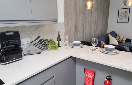 A Modern Style, Open Plan Kitchen, fully equipped, with a Breakfast Bar, leading onto the Lounge, with a feature wall Sofabed and TV.