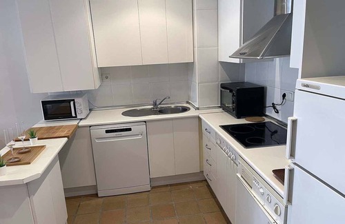 Large apartment with 1 bedroom and 1 bathroom, on the first floor, terrace overlooking an interior garden and east orientation. Air conditioning with heat pump in the living room and bedroom, ceiling fan in the bedroom.