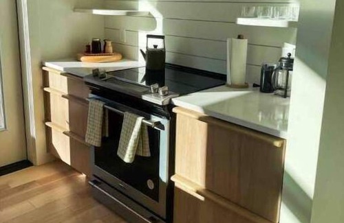 The house is newly constructed and 100 percent complete. However our landscaping will not be complete until mid-Spring. Please be careful accessing the sauna and outdoor shower (which is downstairs and accessible by walking outside the house to the rear of the building) until our landscaped stairs are complete.
