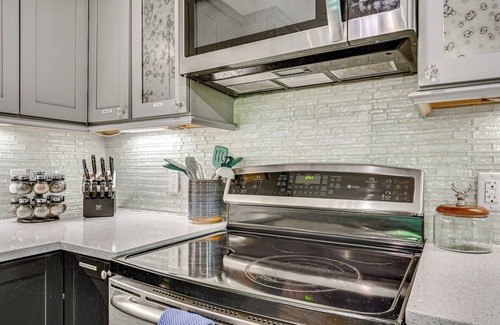 KITCHEN: Fully equipped, stainless steel appliances, cooking basics, spices, dishware & flatware, cookware, Henckels self-sharpening knife set, toaster, drip coffee maker, blender