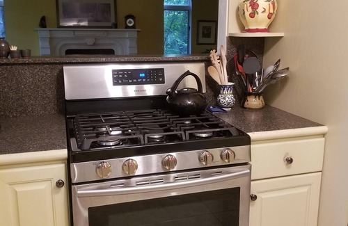 This 3,200 sq. foot custom-built home is ideal if you want privacy in a beautiful, natural setting, located minutes from restaurants/upscale shopping with lots of fun activities nearby, a fully equipped kitchen, 4 bedrooms (king and queen beds), 3 full bathrooms, 20’x20’ sunken living room with wood burning fireplace, cozy family room, formal dining room, 2-car garage, free Wi-Fi and cable TV. Surrounded by 2 private acres of woods and fields, with lots of hiking trails and miles of scenic bike rides close by.
