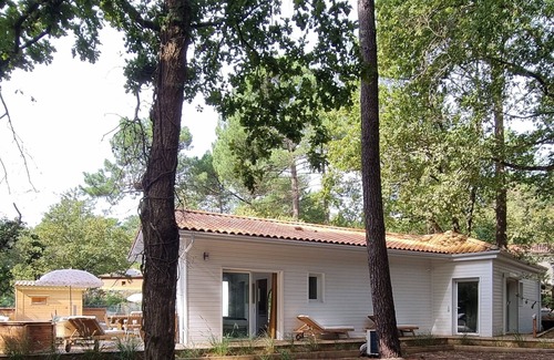 Chalet FOUR Semi-detached with privacy preserved thanks to a tree-lined terrace of 80m² and a private access gate to the swimming pool, equipped with 4 beds, with a view of the Golf de Biscarrosse on one side and the swimming pool and Jacuzzi of the other.