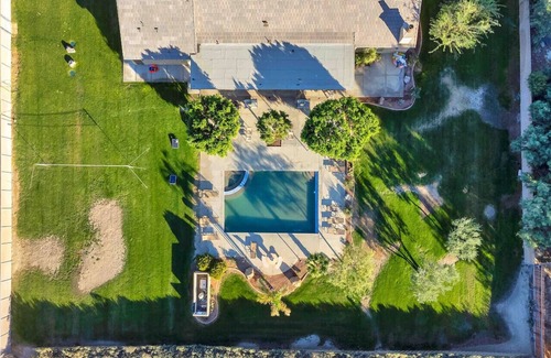 This gorgeous modern hacienda home has beautifully landscaped 2 acre grounds with Mountain Views. If anyone in your group loves sports, there is plenty of grassy areas for soccer, volleyball & basketball (nets & balls are provide). This spacious home features 5 bedrooms with 8 beds. It is also centrally located between Palm Springs, Indio and Palm Desert without the noise and busyness of the city & yet within 3 miles to Walmart & Costco & minutes to all the dining at El Paseo.