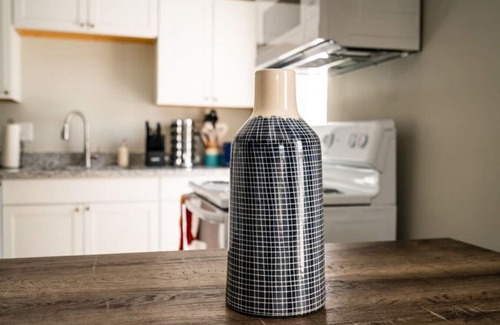 The kitchen comes well-appointed with spices, pots, pans, and even a blender, which is perfect if you plan on cooking a small snack or a full meal!