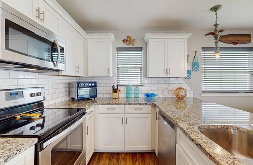 Inside, the home is thoughtfully furnished with comfort and ease in mind. The kitchen is stocked with all the essentials, ready for you to whip up a homemade meal or pack a picnic for the beach. After a day of adventure, unwind in the cozy living area and catch your favorite shows with YT TV. With three full bathrooms, there’s plenty of space for everyone to freshen up and relax.