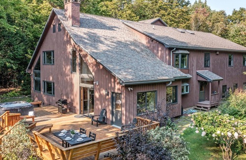 Step outside to enjoy stunning sunsets over Jay Peak from the expansive deck or relax in the private hot tub. In the warmer months, gather around the dining table for a meal with a view or enjoy some laughs around the fire pit by the babbling stream. Right off the property is the Jay Community Trail system, offering trails for hiking, mountain biking, and, in winter, snowshoeing and cross-country skiing.