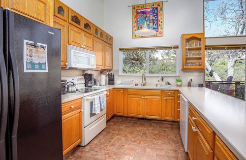 The open-concept floor plan features floor-to-ceiling windows in the living room and master bedroom, offering incredible views of the Sierra Nevada Mountains and Sequoia National Park. The dining area includes a large table with eight-person seating and a fully stocked kitchen. A large deck with a grill and propane provides an outside dining area with stunning views of Sequoia National Park. For those cool evenings, you can enjoy a fire in our wood-burning stove.