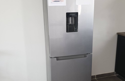 The kitchen is equipped with an oven, a stovetop, and a refrigerator, as well as a coffee maker, a microwave, and cookware. Other amenities include bed sheets, air conditioning, and a dining table.