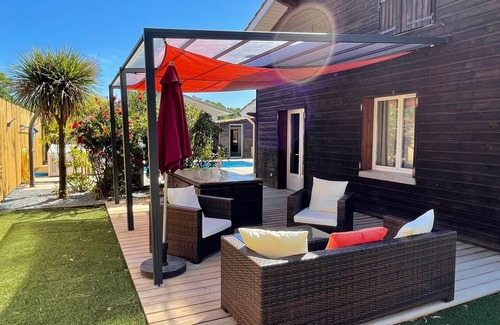 Near Soulac/sea VILLA of 130 M² for 6-8 people (including children) in an exotic setting with air conditioning upstairs and with private swimming pool (6x4) covered heated, surrounded by a wooden terrace of 150 M² with Jacuzzi for 3 people, infrared sauna for 2-3 people.