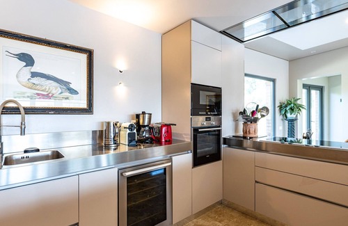 Between the provinces of Pisa and Siena, in the crisp air of the hills, within the Tegoni farm estate is Villa Airone, immersed in a green vortex of dense vegetation that surrounds it in a fragrant embrace of perfume. The villa was built in modern key in 2015, initially conceived as a Club House for the riders of the stables to relax in; it has a framework made entirely of laminated wood, walls in ecological material, insulation in goat-wool panels covered with Siberian larch wood that guarantee the best thermal insulation. It has just one floor, creating contemporary and functional environments with the aim of capturing the wonders of the place in which it lies through large windows. At the front, a natural pond formed by rainwater communicates an energy and a particular charm at all hours of the day and in all seasons. The terrace in front of the villa, the vital centre of the property, is set up with tables and chairs where guests can enjoy the open air in total relaxation while nearby, in a more secluded position, is a heated swimming pool with salt purification, solarium and counter-current swimming. The park surrounding the residence, mainly lawned and dotted with tall leafy trees, extends into the 30-hectare farm which includes an organic olive grove and a free-range piggery of the prized Cinta Senese pigs, stables, due to the owners' great passion for horses, and a large indoor riding school. The main entrance leads into an open-plan area where your attention will be caught by the modern kitchen, an extension of the living and dining room and a tasting room where you can take part in cooking classes, culinary demonstrations and wine-food pairing courses.