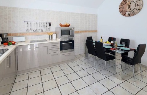 The modern kitchen boasts ample space and is equipped with all the conveniences one would expect from a high-quality villa, including a dishwasher, coffee machine, microwave, iron, toaster, kettle, fridge/freezer, hob, and oven. Additionally, a separate utility room houses a washing machine.