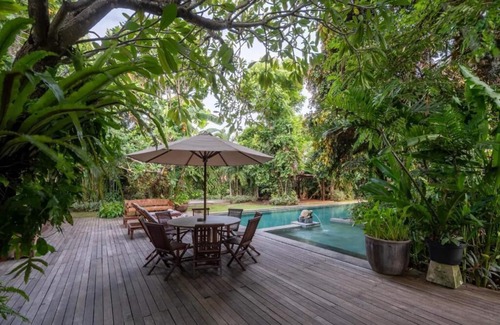 A lush garden surrounds the villa, creating an intimate setting perfect for small weddings, private dinners, or relaxed family gatherings. The large pool, with its sunbeds and outdoor dining space, invites guests to embrace the laid-back Bali lifestyle. The villa’s thoughtful design ensures a balance of relaxation and cultural immersion, making it a truly special place to stay.