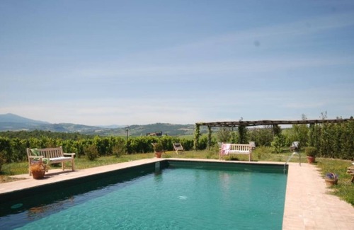 The Val d'Orcia stretches to the south of Siena in a landscape at once harmonious and poetic that strikes the imagination: this is a landscape full of light, characterised by gentle hills rolling as far as the eye can reach and crisp clear colours, distinctly different and enthralling in every season of the year. It is a highly evocative territory, which, precisely on account of the essential perfection of its landscape has been included in the Unesco list of World Heritage Sites: scenery that was celebrated by the artists of the Sienese school, the reproductions of which have become symbols of the Renaissance and have profoundly influenced the mode of conceiving the landscape. In the heart of this natural and cultural Artistic Park, just a short distance from spots of elevated historic and artistic interest (San Quirico d'Orcia is just 1.8 km away, Pienza 3.5 km, with Montalcino and Montepulciano also within easy reach) and famous spas (Bagno Vignoni, Bagni San Filippo, Chianciano and San Casciano dei Bagni), Villa Campriano is set upon a hilltop, commanding a magnificent 360-degree view over the surrounding valleys and hills, with their undulating contours cloaked in woods, farmhouses heralded by rows of cypress trees, churches and ancient hamlets. Considering the passion, the quality of the materials and the loving precision with which it has been performed, the just-completed renovation of this old farmhouse is one of the finest examples in the entire Val d'Orcia. The property extends over 25 hectares of woods and olive groves, has well-tended external areas complete with a panoramic 6x12 m swimming pool, an unusual and attractive internal courtyard and a veranda where guests can eat in the open air. The interiors are spacious and furnished with attention to the tiniest detail, with a large extremely comfortable living area and a splendid Tuscan kitchen on the ground floor, while the sleeping area on the first floor has magnificent bathrooms with large washbasins in travertine stone. The quality furnishings create the atmosphere of the typical houses of the Tuscan countryside, elegant and welcoming. Another special feature of the villa is the delightful breeze wafting up every day from the woods in the valley below to cool the hilltop.