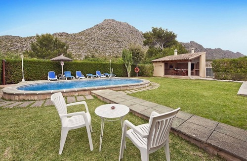 Villa Lluc is a sunny house near the bay of Puerto Pollença, in the residential area of Siller. It is located in a magnificent place, at the foot of the mountains of Boquer just 10 minutes walk to the center of the town and 15 minutes from the beach. In front of the house is covered with vineyards and a garden full of tall palm trees, roses, hibiscus and jasmine. This plantation makes this a lovely place to eat and relax outdoors. Inside, the house has the typical Majorcan design of white walls, ceramic floors and ceilings with wooden beams. There is a large kitchen with fitted units and marble surfaces, a breakfast table and a large pantry. Kitchen appliances include an oven, dishwasher and a microwave. The living room and dining room has comfortable sofas and a long dining table. There is satellite television (all foreign channels), and wifi. There are four rooms with air conditioning. The double room is spacious and well lit and simply furnished, with space for a cot. A door leads from this room to the terrace next to the house and the gardens full of fig, lemon and orange trees and potted plants. There are also three double rooms. All have large fitted wardrobes and one of them has a door that opens onto the garden terrace. These rooms share two bathrooms (the newly renovated central bathroom is wheelchair accessible with shower) and another bathroom with green tiles. Two of the rooms are ideal for a family of four. The garden on the side of the house is very well designed and maintained, with tall palm trees shading the gardens and the pool. It is also very private with hedges and bushes. It is a lovely place to spend the day swimming and sunbathing. There is a large 26.2 square meter covered barbecue area, with plenty of space and a large table and benches so you can eat outdoors, from breakfast to dinner. All very well taken care of by their owners Ana and the gardener Pepe .... It is in a very convenient location to walk to the beach, cafes, restaurants and shops of Puerto Pollença. Although the streets are dark at night so you have to carry a flashlight!It is not necessary to rent a car, but it is convenient for the transfer of purchases in the supermarket and if you have children it is advisable to choose yourself. We have cots and high chair available. We also have security alarm for the welfare of our customers.