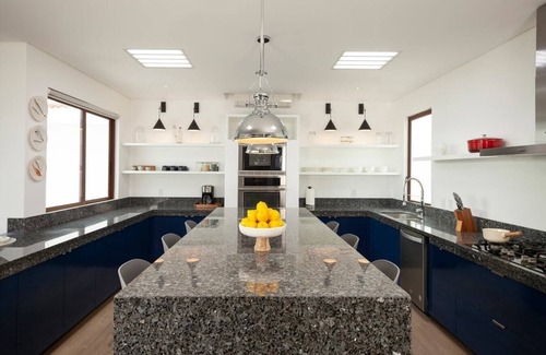 - Fully equipped kitchen with kitchen island and stools.
