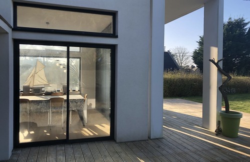This contemporary-style house is located in the Abers region, on the banks of the Aber Benoit. It's a 2-minute walk from the beach, with sea views from the living room, dining area and garden.
