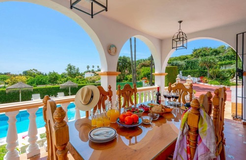 Surrounded by rich countryside and fruit plantations, Villa Finca Rosa is a charming, Moorish-inspired villa located in the area of El Padron. The villa has an impressive pool set amidst well-established gardens and benefits from splendid views of the surrounding landscape. Just a 4 minute drive from the villa is El Padron Beach with a small selection of eateries at the West-end of the seafront. The town of Estepona with a greater choice of beaches, restaurants and shops are further 10 minutes drive away. WiFi and air conditioning/heating in the bedrooms are included.