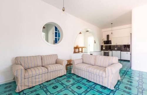 The entrance to Villa Giusy 2 is into a large furnished living room with open kitchen, dining room, sofas and TV.