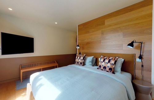 Built over two levels, the sumptuous villa LA ISLA welcomes guests in large spaces open onto the terrace, with wooden cladding on the exterior walls bringing a warm touch to this contemporary place. In the living room, you will love the high vaulted ceilings above the lounge open onto the swimming pool and furnished with comfy sofas, coffee tables and HDTV for pleasant movie nights. There is a large indoor dining room which can accommodate up to eight guests under beautiful lights, close to the well-equipped kitchen with large breakfast bar and stools. Wood, soft cushions, taupe colors and shimmering lights create a delightful and most relaxing atmosphere in front of the large bay opening onto the terrace.