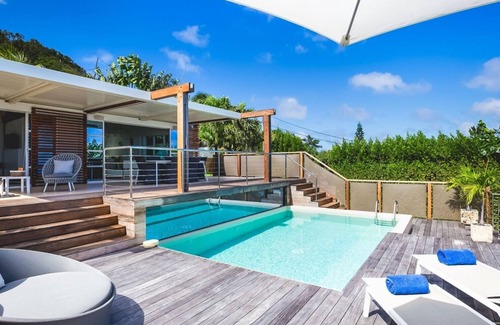La Magnifica is situated on the hillside of Vitet. The villa has a very nice ocean view on Toiny bay. The long pool and outside area is very pleasant. This spacious contemporary villa has one master bedroom overlooking the ocean and a small bedroom below the villa with no view. It is a perfect villa for one couple.