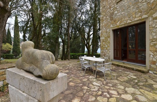 Villa Le Querciolaie is an old 10-hectare estate situated on the outskirts of Monteverdi Marittimo whose owner Rolando Stefanacci, internationally renowned sculptor, lives in the 16th century Florentine style villa. The property is surrounded by the generous nature of the inland hills as far as the Etruscan Coast and the crystalline blue Tuscan sea. The sculptor restored some stone rural buildings and decorated them with lots of sculptures in travertine, pietra serena and bronze. Distances: 15 km from Castagneto Carducci (riding school), 20 km from Donoratico (beaches and tennis), 42 km from Massa Marittima, 50 km from Volterra, 55 km from Punta Ala (well-known port and golf club). The villa is located in a quiet location and enjoys a magnificent panoramic view.